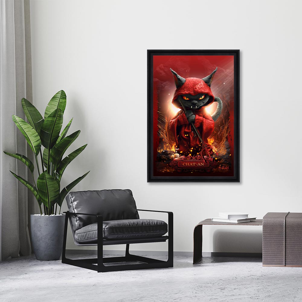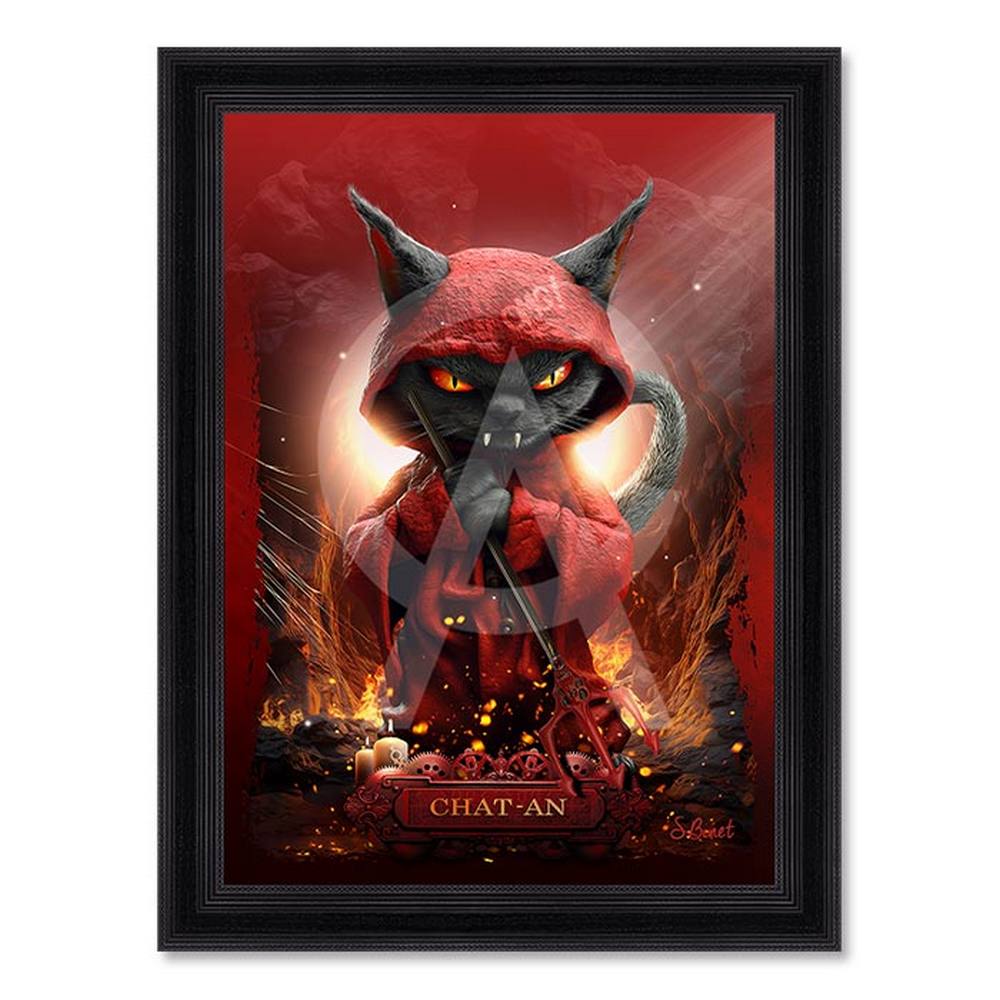 Cette décoration murale est une reproduction encadrée sans verre de l’artiste Sylvain Binet. Elle représente un chat noir, un vêtement rouge sur le dos et trident à la main, qui semble se trouver en enfer. Un petit clin d’œil pour Satan, le diable chez les chrétiens.