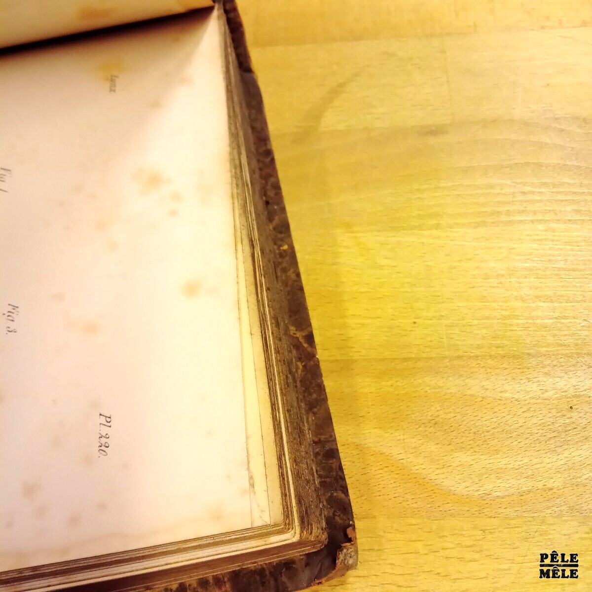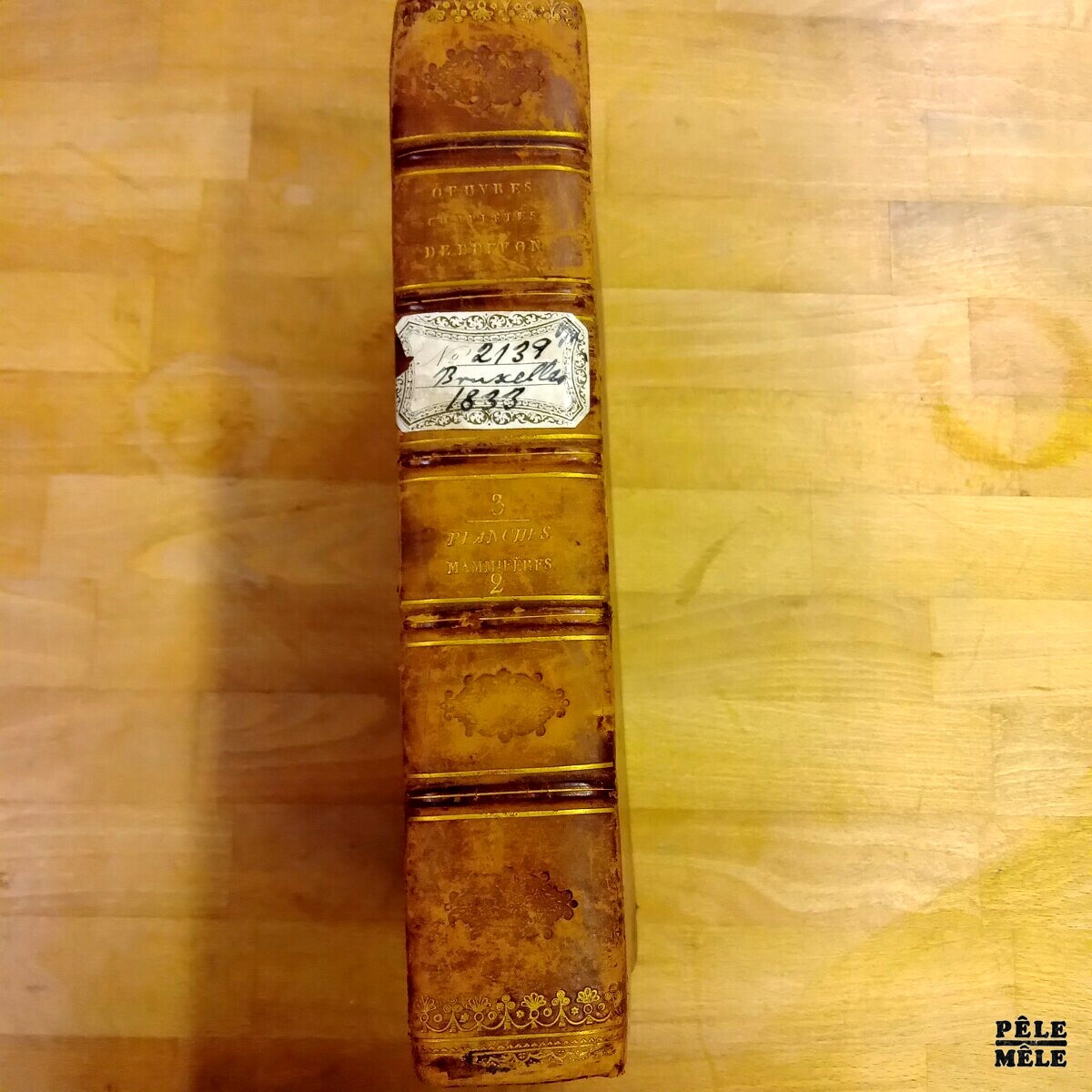 La couvrure en tête est désolidarisée du dos / Cuir frotté en tête, sur dos, sur nerfs et en chasses / Cartons apparents en chasses et coins / Papier marbré élimé et parfois déchiré sur plat / Le papier ainsi que les serpentes ont pas mal de rousseurs et de piqûres / La tranche jaspée en tête a bavé / Le rognage des tranches n’est pas très équilibré